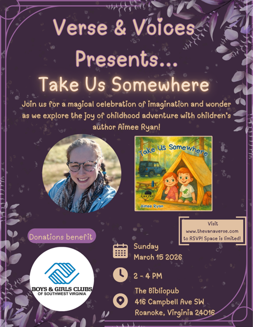 Designed especially for kids (but also for kids at heart!), this event is all about storytelling, creativity, and hands-on fun. Bring your little readers, your curiosity, and your imagination! To accompany our first featured children’s author, this event will also serve as a fundraiser benefiting the Boys and Girls Club of SWVA, who serves over 1,200 children in the area, focusing on academic and personal growth and success. Donate now using the form below! The BiblioPub will be providing a matching gift!